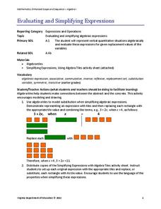 Discover how algebra tiles help evaluate expressions. Scholars learn to use algebra tiles to substitute values in for variables and evaluate expressions. The included worksheet contains a set of evaluation problems to assess individuals'...