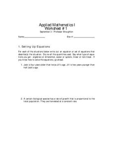 In this setting up equations worksheet, students solve 4 different problems that include setting up the equations in each problem. They write out an equation or set up an equations that describe each given situation. Then, students state...