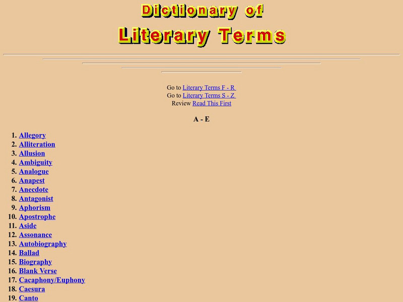 The first of three pages of simple definitions for literary terms. This page, A - E, covers forty-four terms from "Allegory" to "Exposition."