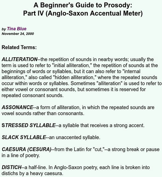 This resource provides a great history and explanation of Anglo-Saxon accentual poetry along with some excellent examples. Before the article, a number of related terms are defined including the following: alliteration, assonance,...
