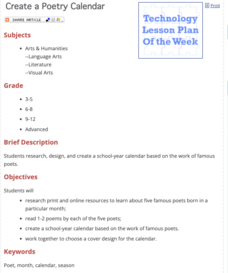 Students research the work of famous poets. They design and create a school year calendar based on the work of famous poets. Students research five poets born during each month.