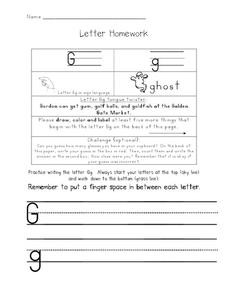 For this recognizing and using the letter Gg worksheet, students sign the letter in sign language, copy a letter Gg tongue twister, draw, color, and label five or more items that begin with the letter Gg, and complete an optional...