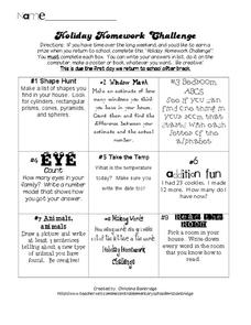 In this holiday homework challenge worksheet, pupils participate in completing nine mini homework assignments for a prize when they return from the holiday break.