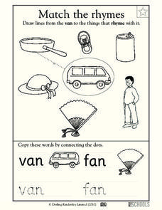 Explore CVC words with the vowel sound a to give pre-readers a grasp of rhyme. They draw lines from a van to surrounding pictures that rhyme (man, pan, fan, can). Then, leaners get printing practice by tracing the words van...