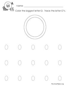 In this alphabet letter O worksheet, students color the big letter O on the worksheet and then trace the uppercase alphabet letter O 15 times.
