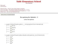 In this interactive letter recognition worksheet, students type in the lowercase letters of the alphabet. Students also listen to an audio clip of 30 words and select the first letter sound.