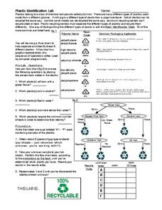 In this plastics worksheet, students experiment with an unknown plastic and determine the polymer name and resin code by using a flow chart of various tests. They answer five questions after they collect their data.