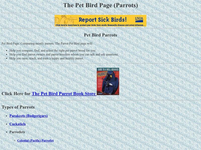 This site from The Pet Bird Page is a site developed to help find, compare, and select breeds of pet parrots as well as inform parrot owners on care, raising, and training of their pet birds.