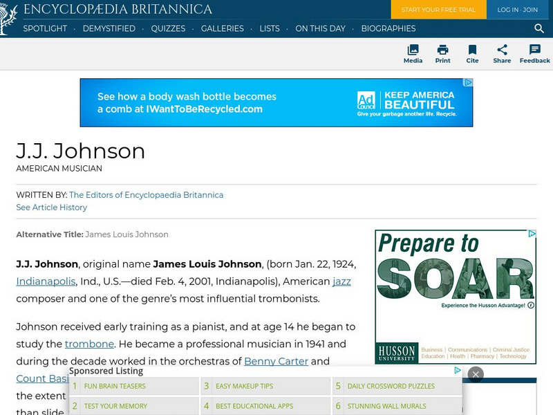This entry from Encyclopedia Britannica features J.J. Johnson, an American jazz composer and one of the genre's most influential trombonists.
