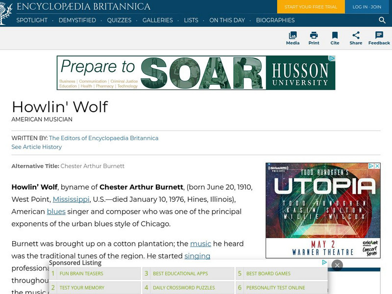This entry from Encyclopedia Britannica features Howlin' Wolf, an American blues singer and composer who was one of the principal exponents of the urban blues style of Chicago.