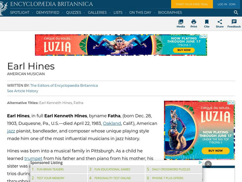 This entry from Encyclopedia Britannica features Earl Hines, an American jazz pianist, bandleader, and composer whose unique playing style made him one of the most influential musicians in jazz history.
