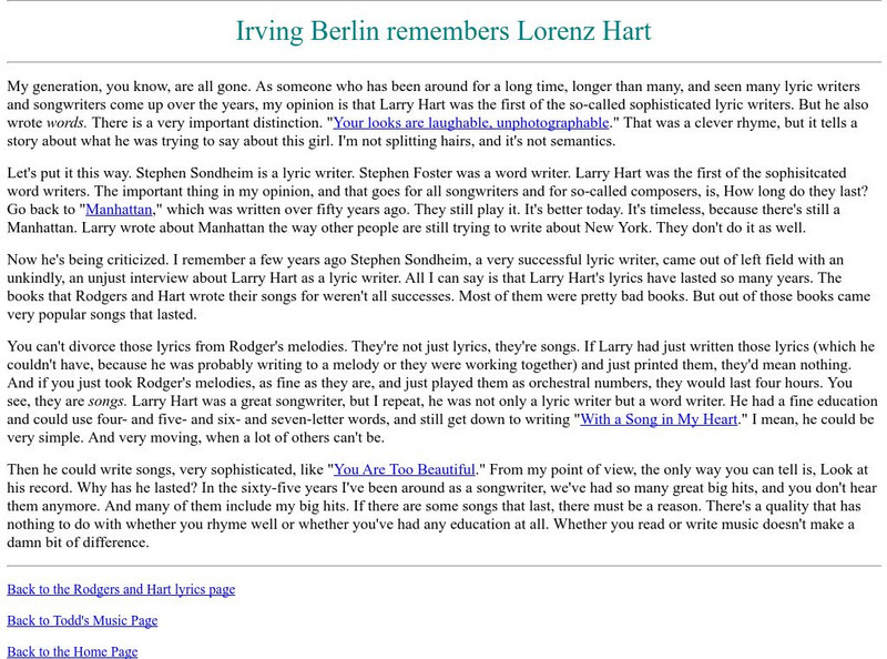 Irving Berlin talks about famous lyricist Lorenz Hart, of the famous writing duo Rodgers & Hart. He discuss his impact on music on culture.
