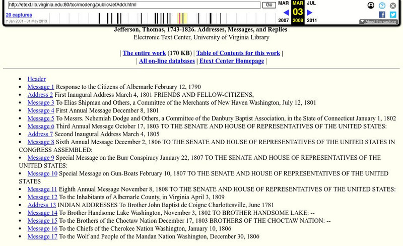 In this collection from the University of Virginia you can read miscellaneous kinds of correspondence by Jefferson, including letters about American Indian issues and annual addresses to the House and Senate.