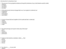 Test your class on anatomy vocabulary words with this quiz. Pupils identify various parts of the human body by choosing the correct term for each given description. This is a basic multiple choice quiz with 10 questions. Class members...