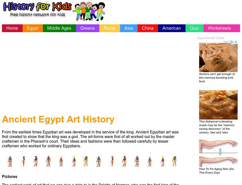 Article teaches kids about the paintings found in ancient Egypt. Students learn about style, color, media, and the meaning behind Egyptian art. Includes photos, links to worksheets, coloring pages and quizzes.