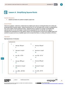 Students simply roots and organize it. In this algebra lesson plan, students solve radicals by simplifying them. They solve for squares by taking the square root of both sides of the equation. They simplify and rationalize the denominator.