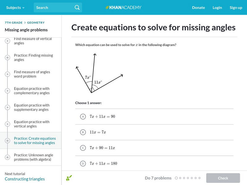 Use understanding of vertical, complementary, and supplementary angles to set up an appropriate equation to solve for a missing angle measure. Students receive immediate feedback and have the opportunity to try questions repeatedly,...