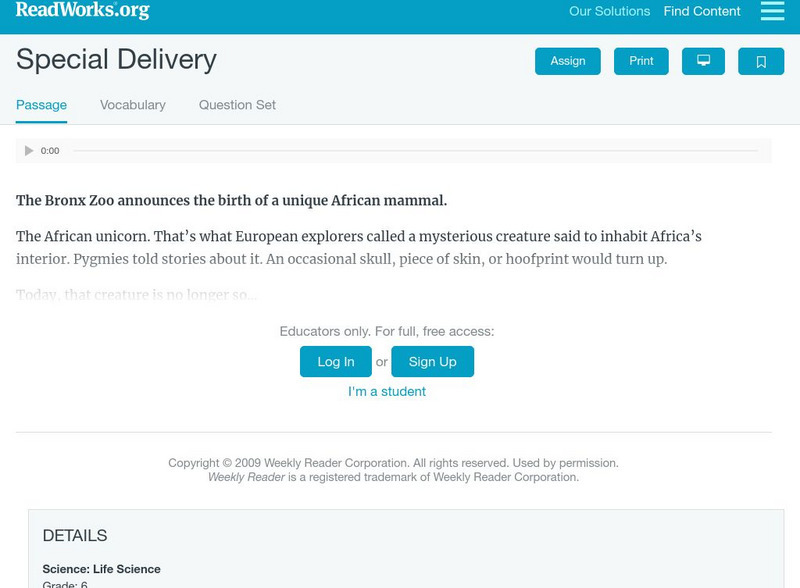 [Free Registration/Login Required] An informational text about the birth of okapis in captivity. A question sheet is available to help students build skills in reading comprehension.