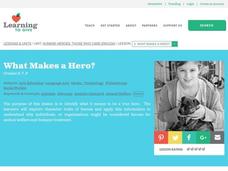 Middle schoolers identify the characteristics of a hero. In this character development and writing lesson, students listen to music with a hero theme and discuss the common traits of heroes. Middle schoolers explore individuals and...