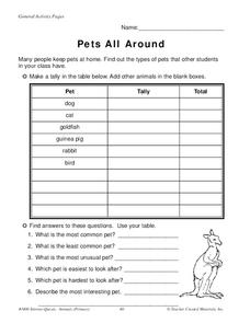 In this information table learning exercise, students will survey their classmates to find out what types of pets they have at home and record the information using tally marks on a table. Then students will answer 6 short questions...