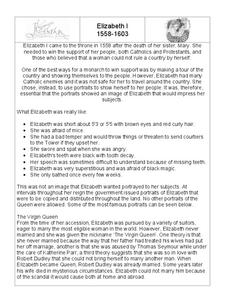 In this English monarchs worksheet, students read a one page text with facts about Elizabeth I. Students study 10 portraits of Elizabeth I showing her at different ages. There are no questions to answer.