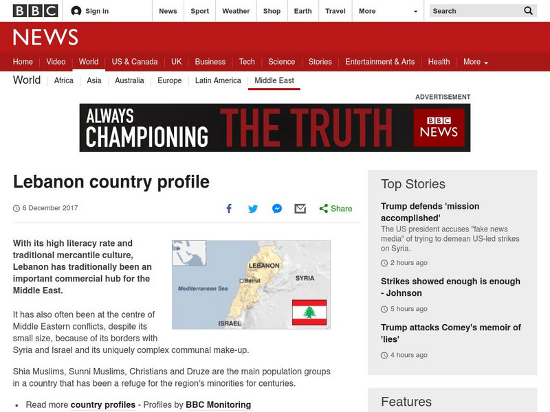 The BBC discusses the country of Lebanon which is at the center of much of the conflict in the Middle East. Gives an overview of its history, talks about its leadership, provides a timeline of key events, and links to other key stories.