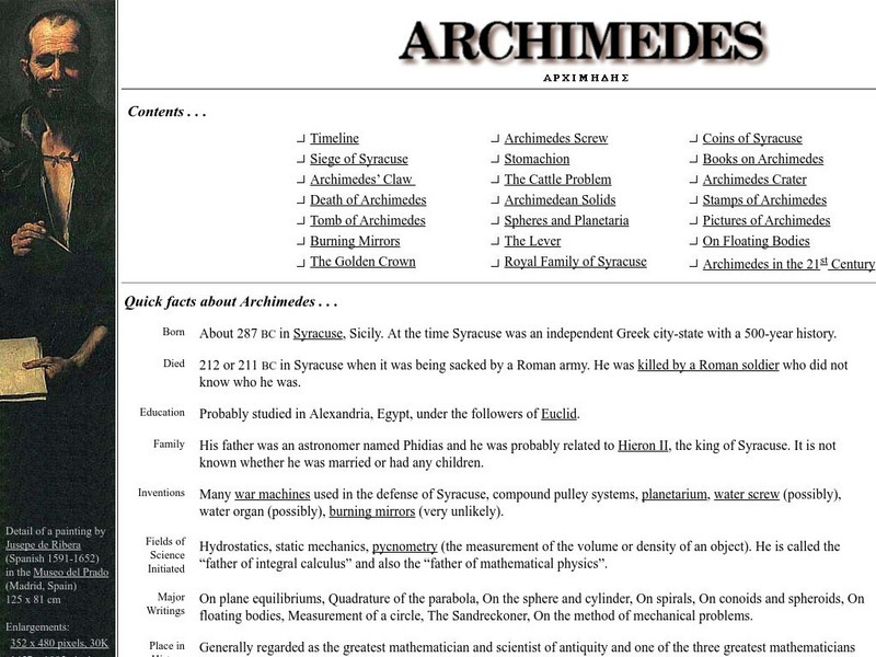 Contains information about the life and works of Archimedes. Includes a Pi applet. Has links to Eratosthenes of Cyrene, A listing of Pi to 10,000 digits, a biography of Archimedes, notes on Pi, and sources on Archimedes' screw.