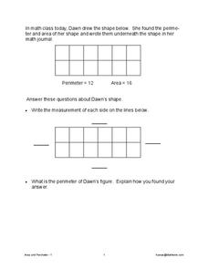 In this geometry instructional activity, students complete a homework assignment in which they draw rectangles that have the same area but different perimeters and vise versa. They draw a rectangle with a given area and perimeter.