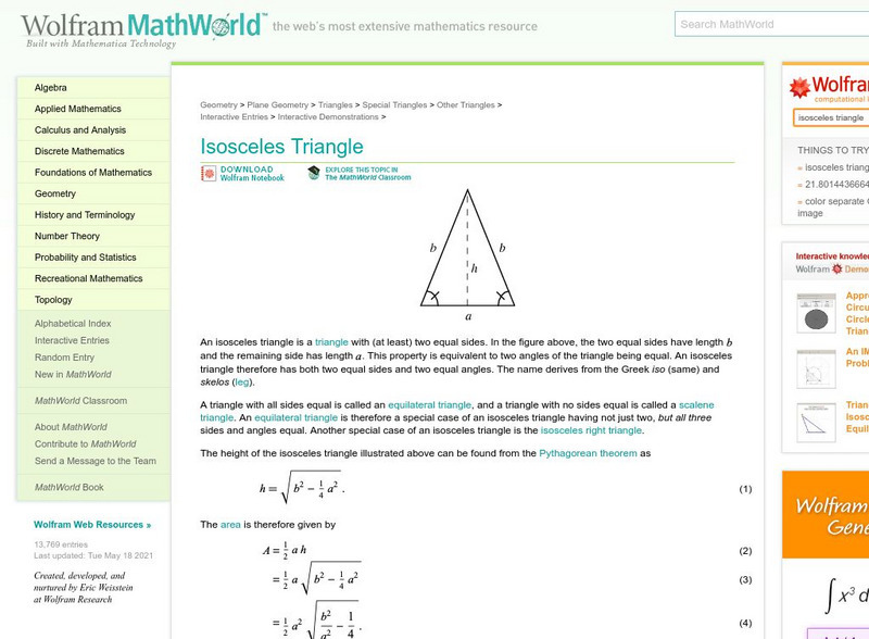 MathWorld explains what an isosceles triangle is and how it compares with equilateral, and scalene triangles. The altitude and area of these triangles are also discussed.