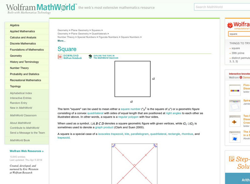 MathWorld provides multiple definitions and formulas for the mathematical term, square.