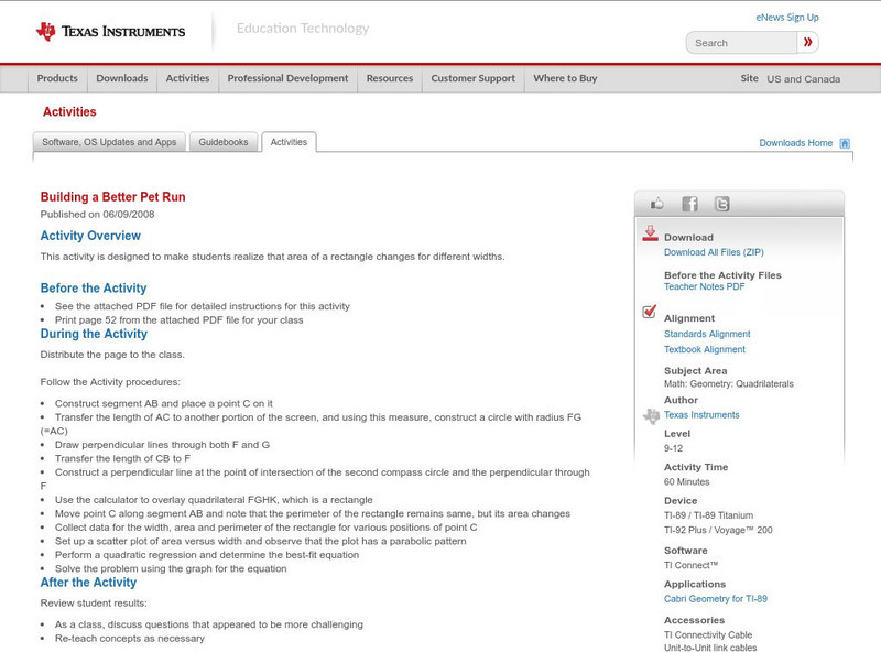 Middle schoolers study the important characteristics of quadratic relationships by exploring the area of rectangles with a fixed perimeter. This lesson involves tables, graphing and patterns. This Lesson is adapted from a Connected Math...