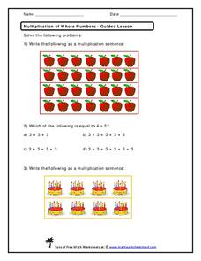In this introduction to multiplication worksheet, students use arrays and counters to understand the multiplication process. In this problem solving worksheet, students find the answers to three problems.