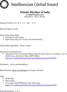 Students listen to and dance to the music of India. After listening to the music again, they identify the different types of instruments playing the melody. They explain the tabla tarang and view photographs of people performing the music.