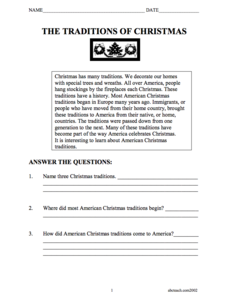 For this holiday reading comprehension worksheet, students learn about 3 common Christmas traditions: wreaths, stockings, and decorated trees. Students read facts about each and answer questions.