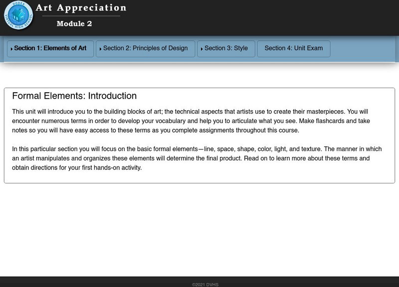 In this third unit of a course on Art Appreciation, students learn how to describe the technical aspects of an artist's work by discussing elements of art and principles of design. They also look at the stylistic qualities of an artist's...