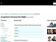 In this online interactive reading comprehension worksheet, students respond to 25 multiple choice questions about Eugene O'Neill's Long Day's Journey into Night. Students may submit their answers to be scored.