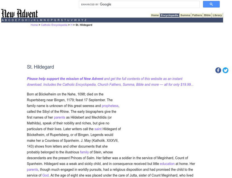 Exerpt from the Catholic Encyclopedia about St. Hildegard. Please note that ?The Catholic Encyclopedia? is a historic reference source and should be viewed in the context of resource material dated around 1910.