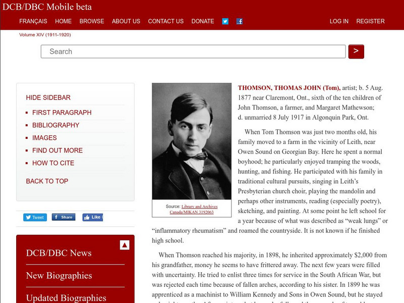 Comprehensive biographical information on the life and works of Canadian landscape painter Tom Thomson, who drowned before he could become an official member of the Group of Seven.
