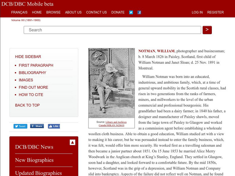 Great biographical reference tool for finding comprehensive information on Canadian photographer and businessman, William Notman.