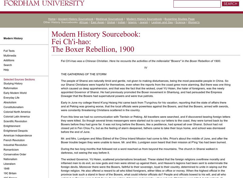 Fordham's Modern History Sourcebook offers a Chinese Christian's account of the Boxer Rebellion in China.