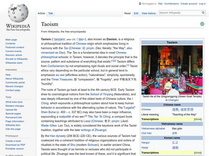 Wikipedia offers excellent information on the history and practices of the Asian philosophy, Taoism.