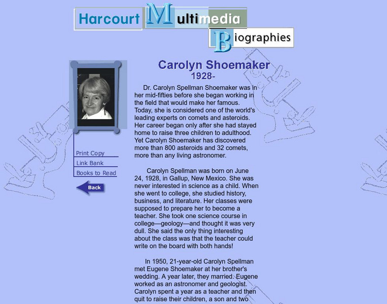 This is a biography of Carolyn Shoemaker. This account tells of her growing up with no interest in science, then discovering more comets and asteroids than any other living astronomer. Links to additional material and photographs are...