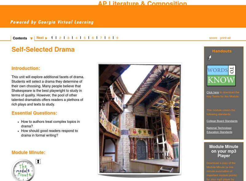 This unit focuses on the students selecting a play to read and study from an extensive list provided. A link to key drama terms is provided. Student read and respond to their selected text, learn the vocabulary, and take a quiz.