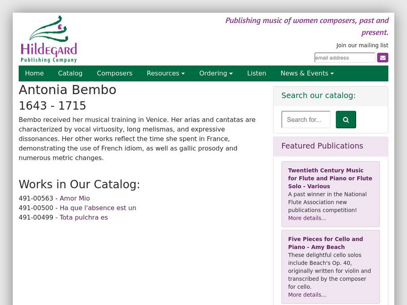 A paragraph of biographical information on Antonio Bembo, a female composer of the Early Baroque period.