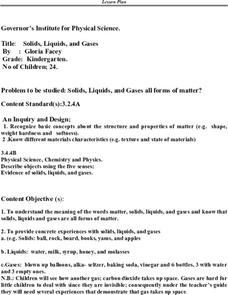 Students explore the three main forms of matter: solid, liquid, and gas. They examine concrete examples of each, using their five senses and "experimenting" to find differences in them. They find pictures of each, cut them out and past...