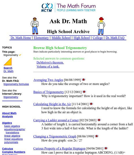 This site from the Math Forum with Dr. Math is an excellent site with answers to submitted questions on trigonometry. In addition the student can submit their own questions. Links are provided for additional information.