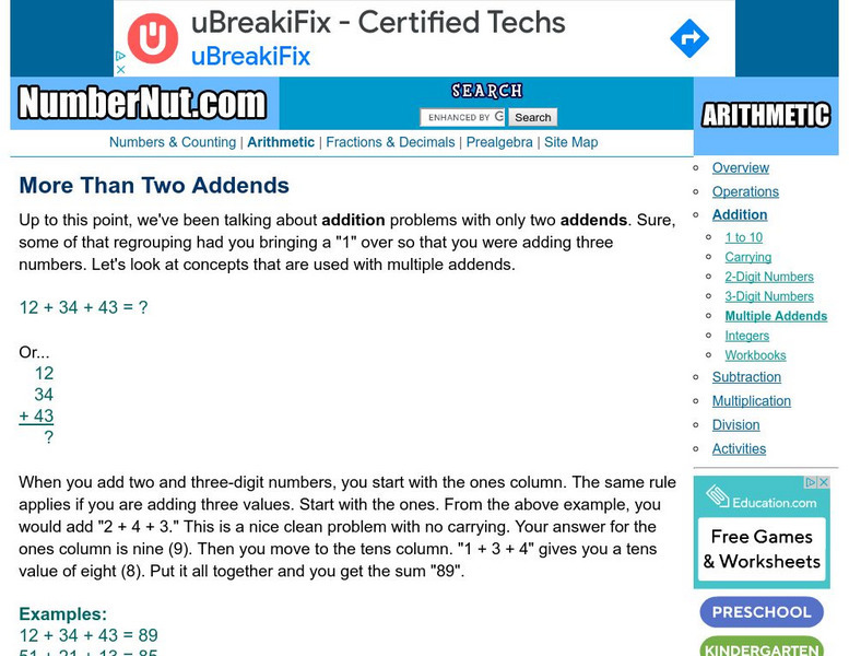 This lesson has an explanation for adding two-digit numbers using paper and pencil. There is also a game to practice your skills. The game gives you a percent score of your correct answers, as well as running totals of your correct and...