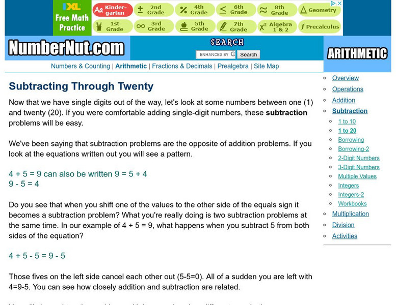 Explains how to subtract numbers from twenty or less, with reference to using addition to find the difference.