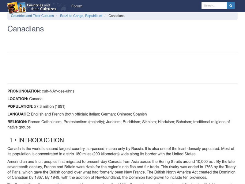 Provides an overview of the culture of Canada. Gives basic information on topics such as geography, ethnic makeup, languages, symbolism, economy, food, customs, social stratification, family life, education, religion, politics, etc....