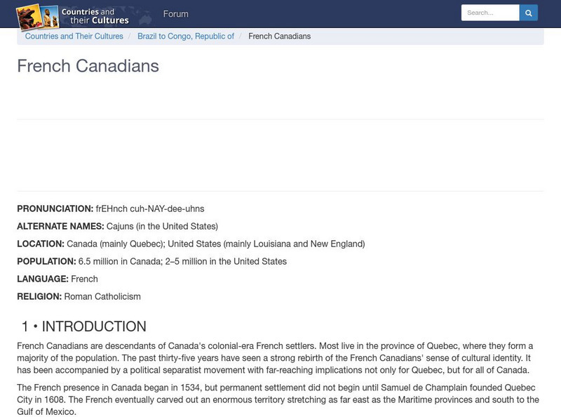 Provides an overview of the traditional culture and lifestyle of French Canadians. Gives basic facts about location, language, folklore, foods, social customs, family life, education, religion, pastimes, societal challenges, etc. (Note:...